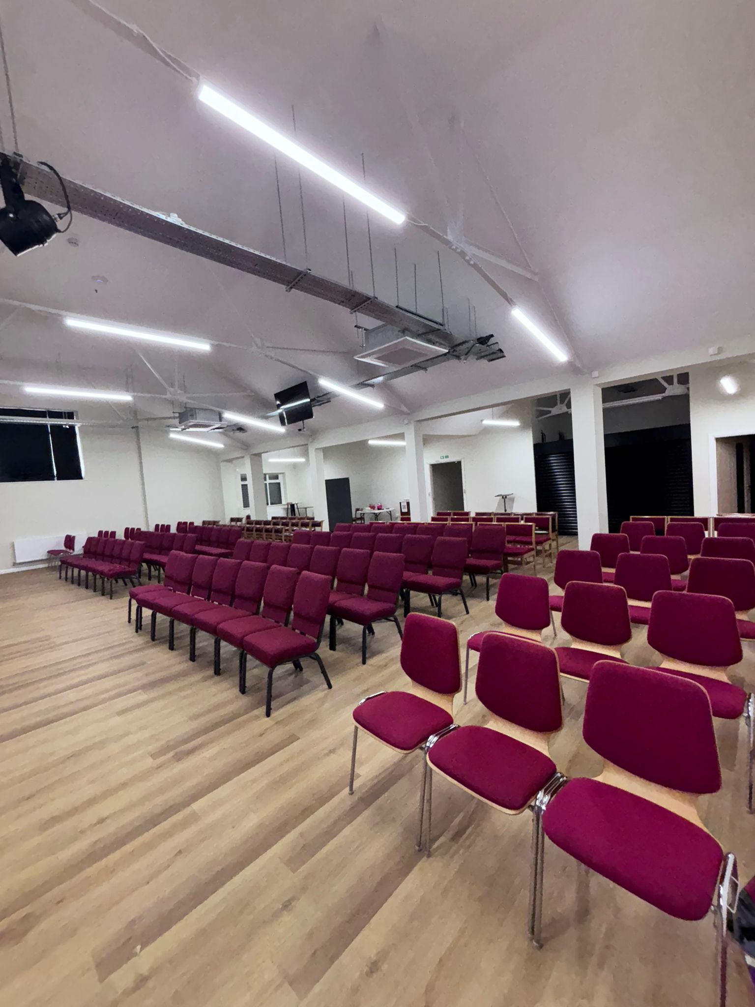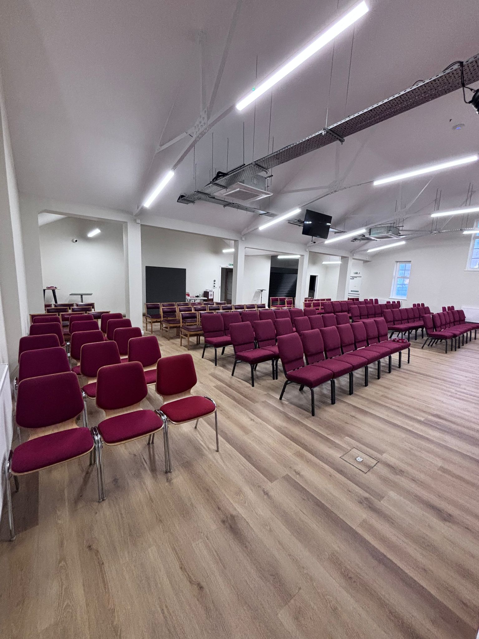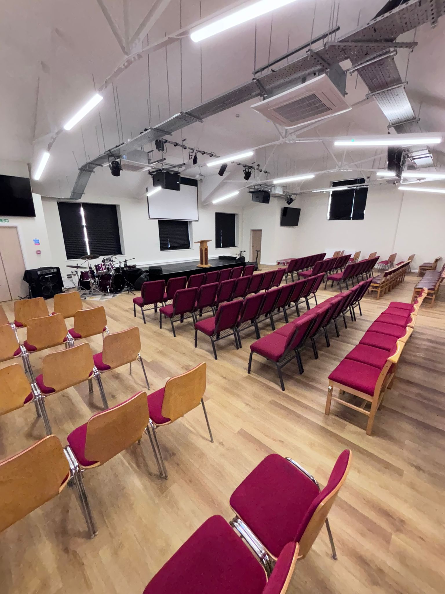 Two main spaces are available for hire: Cafe 3:16, which seats about 65 people, and the main church hall, which can seat about 200 people, depending on how the chairs are arranged. Cafe 3:16 is excellent for small wedding receptions, children’s parties, community meetings, and more. The main church hall is probably suitable for churches and other larger events. And for even bigger events, our stage is removable to give an even bigger area.